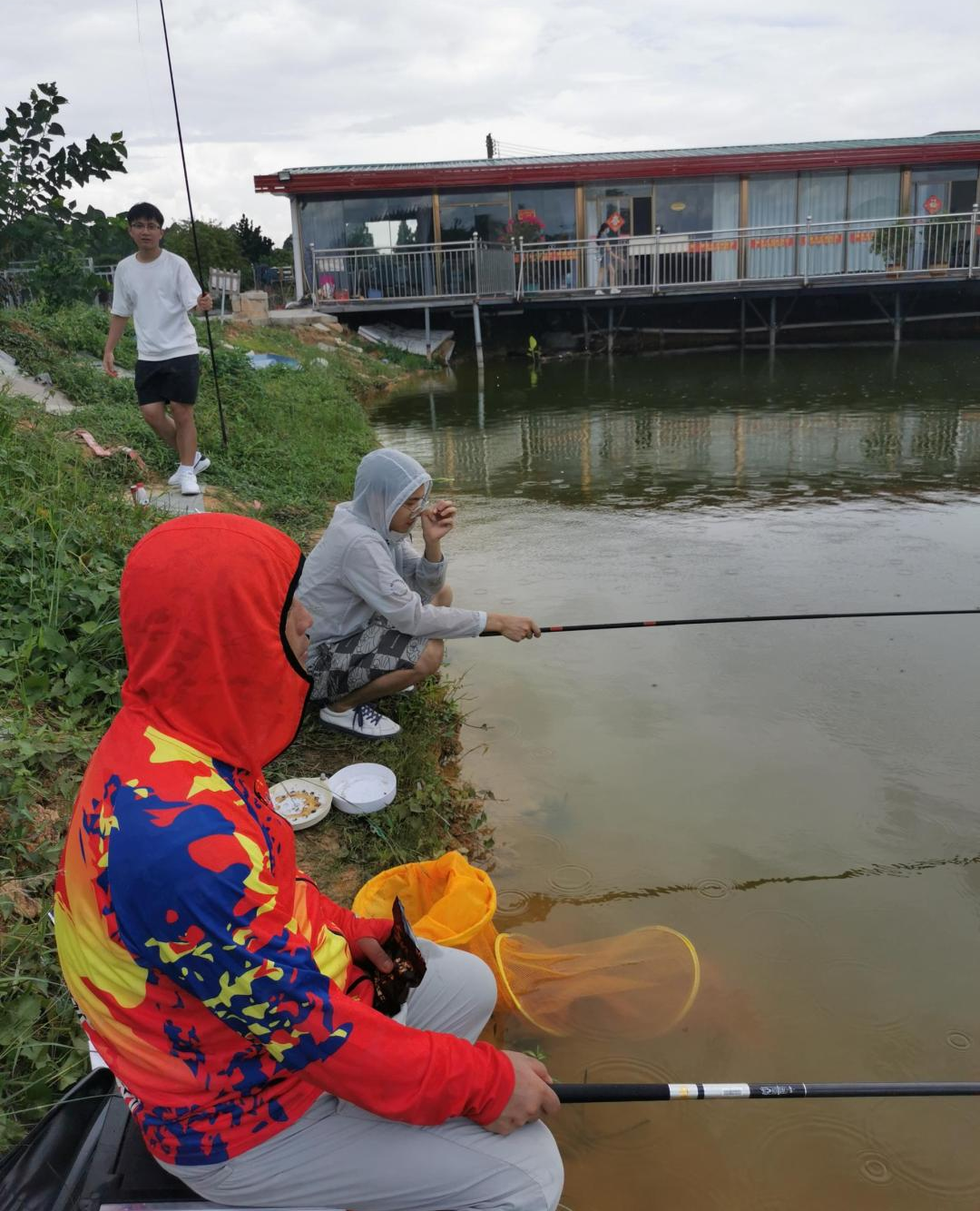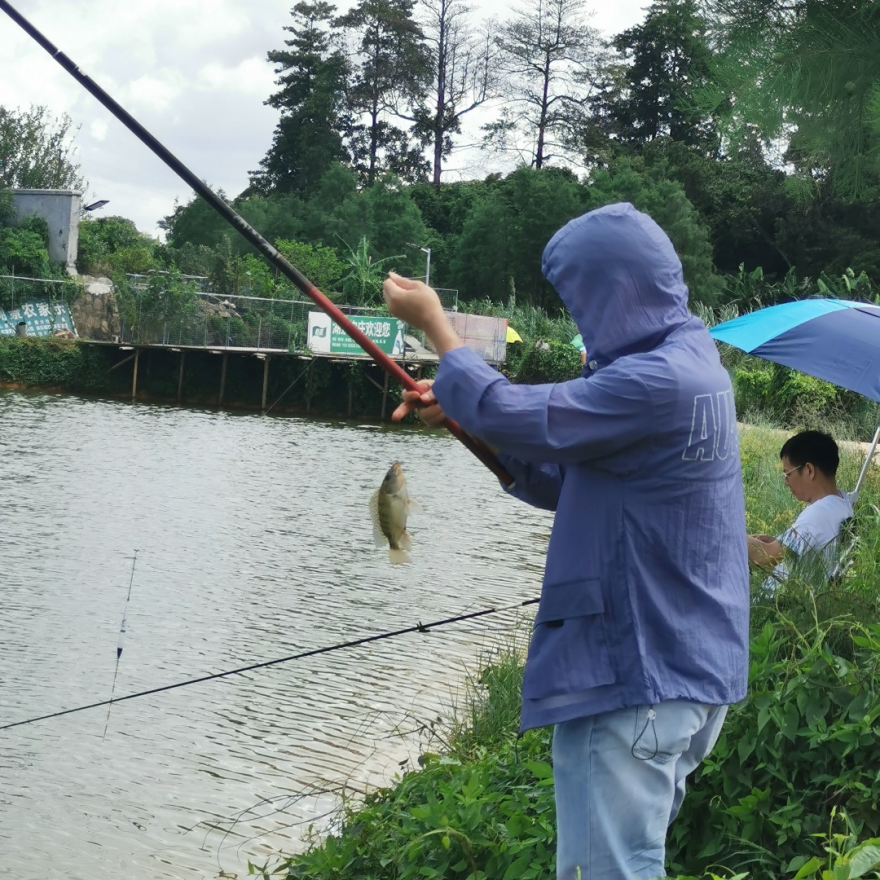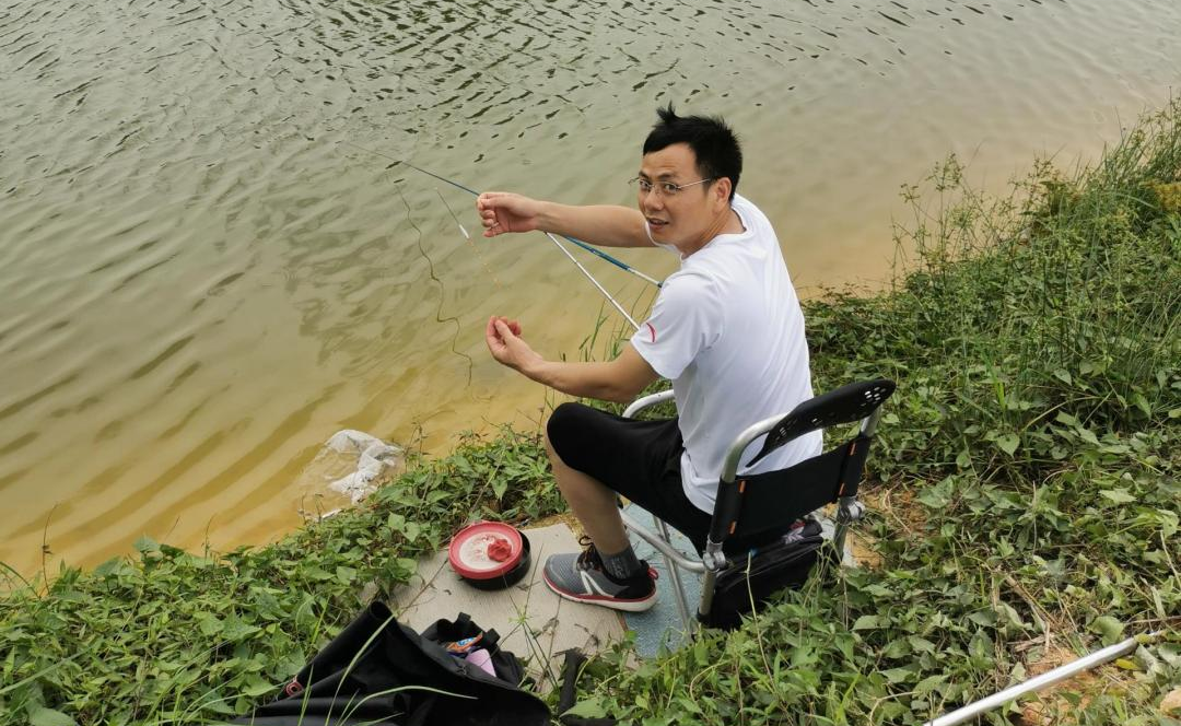 早上9点,到达松山湖湖景区后,大家情绪高涨,便迫不及待地拿出准备好的渔具,将钓竿甩向自己锁定好的区域,准备好鱼食和鱼饵,有的蹲坐有的站在那里静静地等待着鱼儿的上钩。
